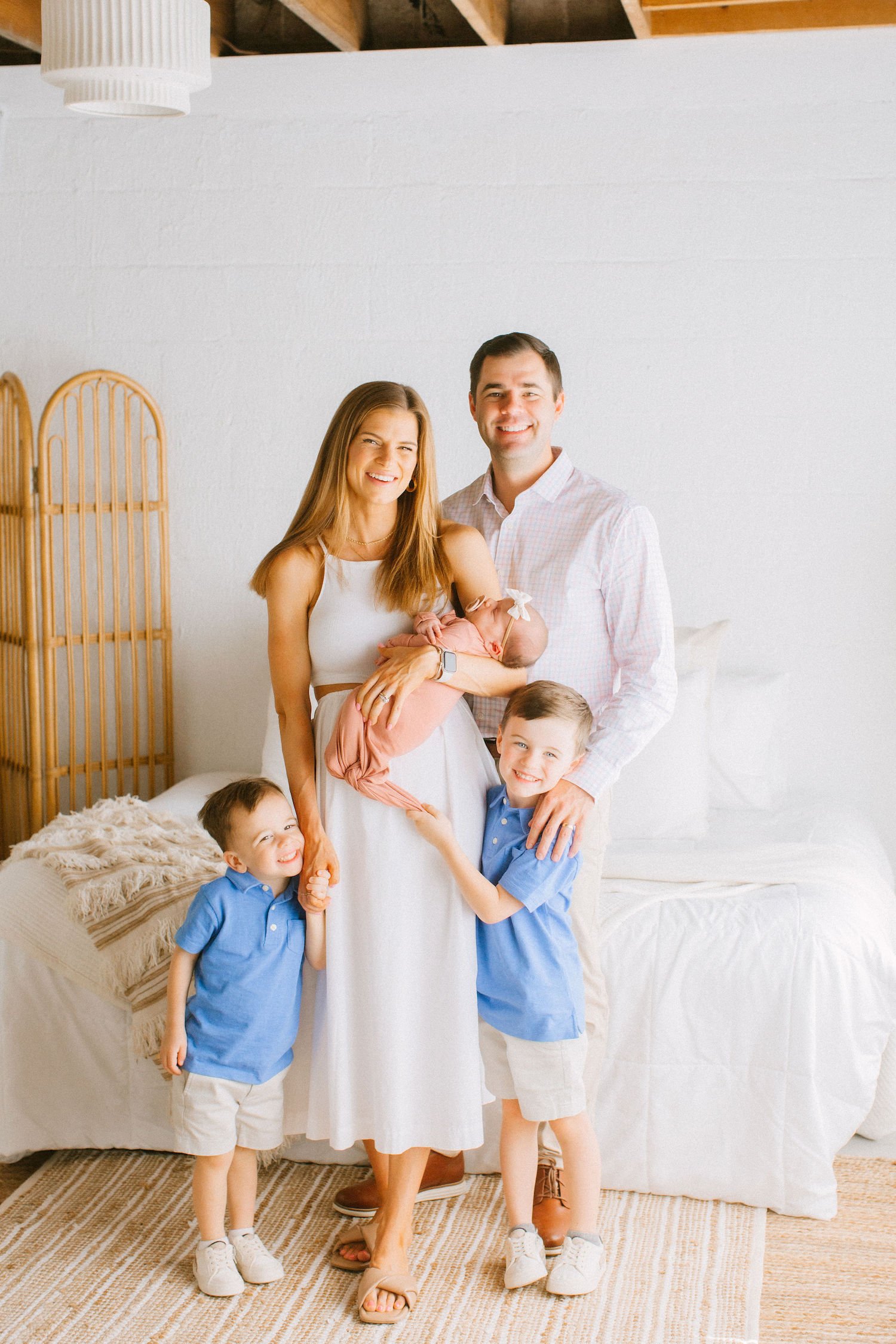 As you’ll see in these photos, I like to style a bedroom scene in my studio pretty minimally with white/neutral colors. My goal is that it feels cozy and homey, but that the emphasis and focus is still on YOU and your people. I want to create an atmosphere where you can simply show up and feel comfortable. And besides, let’s be honest, “just showing up" is not actually that simple. After coordinating outfits and changing diapers and feeding the baby, etc, you deserve an award for simply being here at all! I commend you. The photos will of course be worth it though. 💛